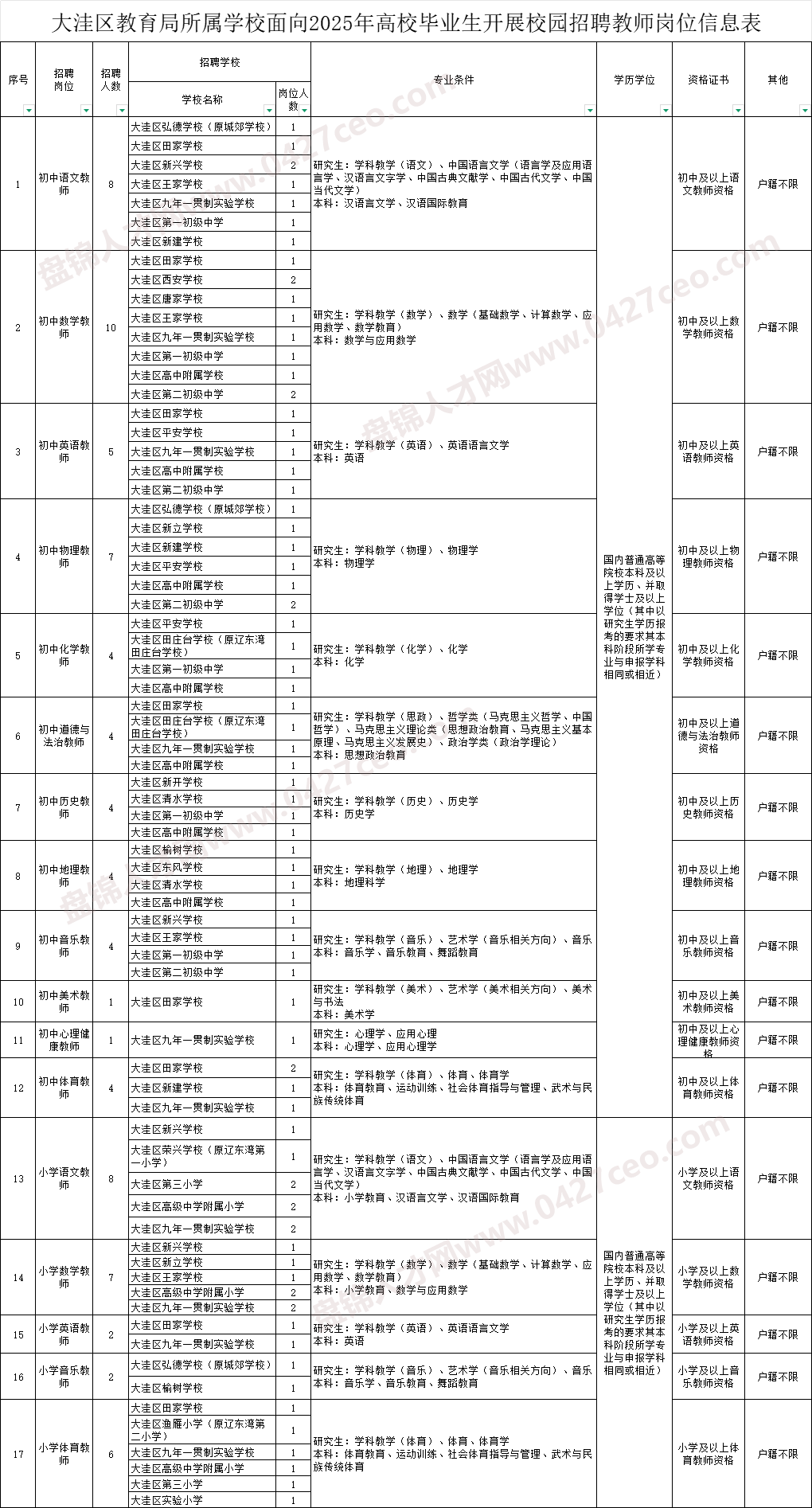 2.具體招聘崗位和資格條件詳見(jiàn)《大洼區(qū)教育局所屬學(xué)校面向2025年高校畢業(yè)生開(kāi)展校園招聘教師崗位信息表》(附件1)。