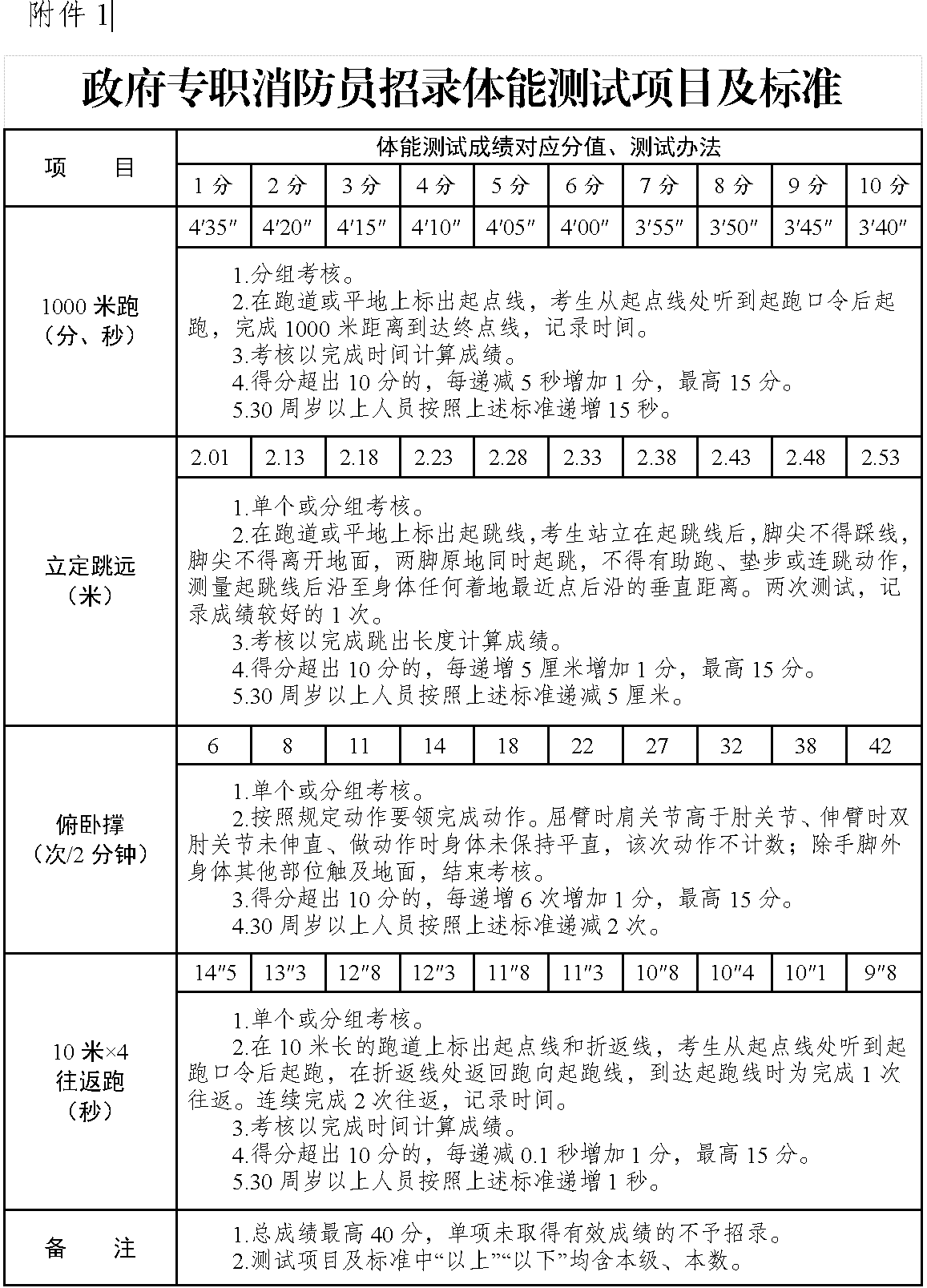 (四)體能測(cè)試。按照《政府專職消防員招錄體能測(cè)試項(xiàng)目及標(biāo)準(zhǔn)》(附件1)執(zhí)行。體能測(cè)試實(shí)行量化評(píng)分,單項(xiàng)有效成績(jī)?yōu)?分~15分(未取得有效成績(jī)的不予招錄),總成績(jī)最高40分。