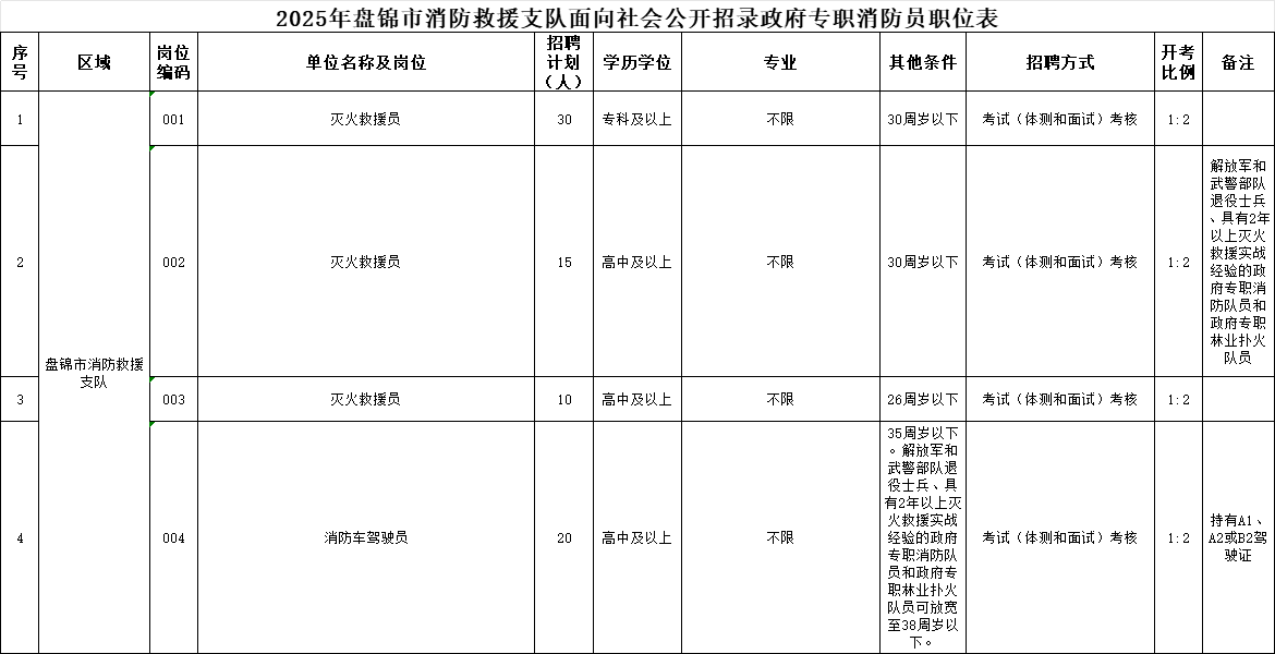 3.2025年盤錦市消防救援支隊面向社會公開招錄政府專職消防員職位表